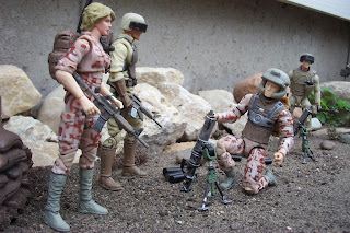 This is the second version of Spearhead I've done. The first was much more accurate to the vintage figure - the color scheme was closer and it included the vintage weapon, backpack and his pet bobcat Max. I was actually happy with that version until I acquired this headless body in a trade with fellow HissTank member Mermaniel. It's mostly a repainted Dusty figure from the Pursuit of Cobra line, but I was really impressed with his replication of the 1990's U.S. military "chocolate chip" camouflage pattern that I remembered so well from my USMC days. As soon as I received the body, I knew it would end up being a replacement Spearhead. In a moment of complete laziness, I used a Rise of Cobra Channing Tatum head sculpt - mostly because I had so many extras lying around, but also because I hadn't bothered to use the head anywhere in my collection yet. I added a repainted backpack from the 25th Anniversary Sgt Airborne and a CAR-15 rifle from Marauder Gun Runners. I added an AN/PVS-4 Night Vision Scope and a suppressor (both also from Marauder) to the rifle, as I found them to be appropriate for a pointman. At first, I wasn't going to post this figure, because someone else painted the figure. All I really did was add a new head and customize a rifle and pack for him... But then I decided that I dug the figure enough that I wanted to share him, easy custom or not.
